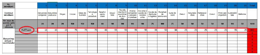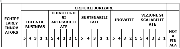Planurile de afaceri inscrise in concurs vor fi alocate in mod aleatoriu membrilor juriului. Fiecare jurat scrie o scrisoare de feedback pentru fiecare plan de afaceri evaluat. Aceste scrisori vor fi disponibile pentru download in fereastra aferenta fiecarui cont. Fiecare intrebare are un numar maximum de puncte care poate fi alocat.